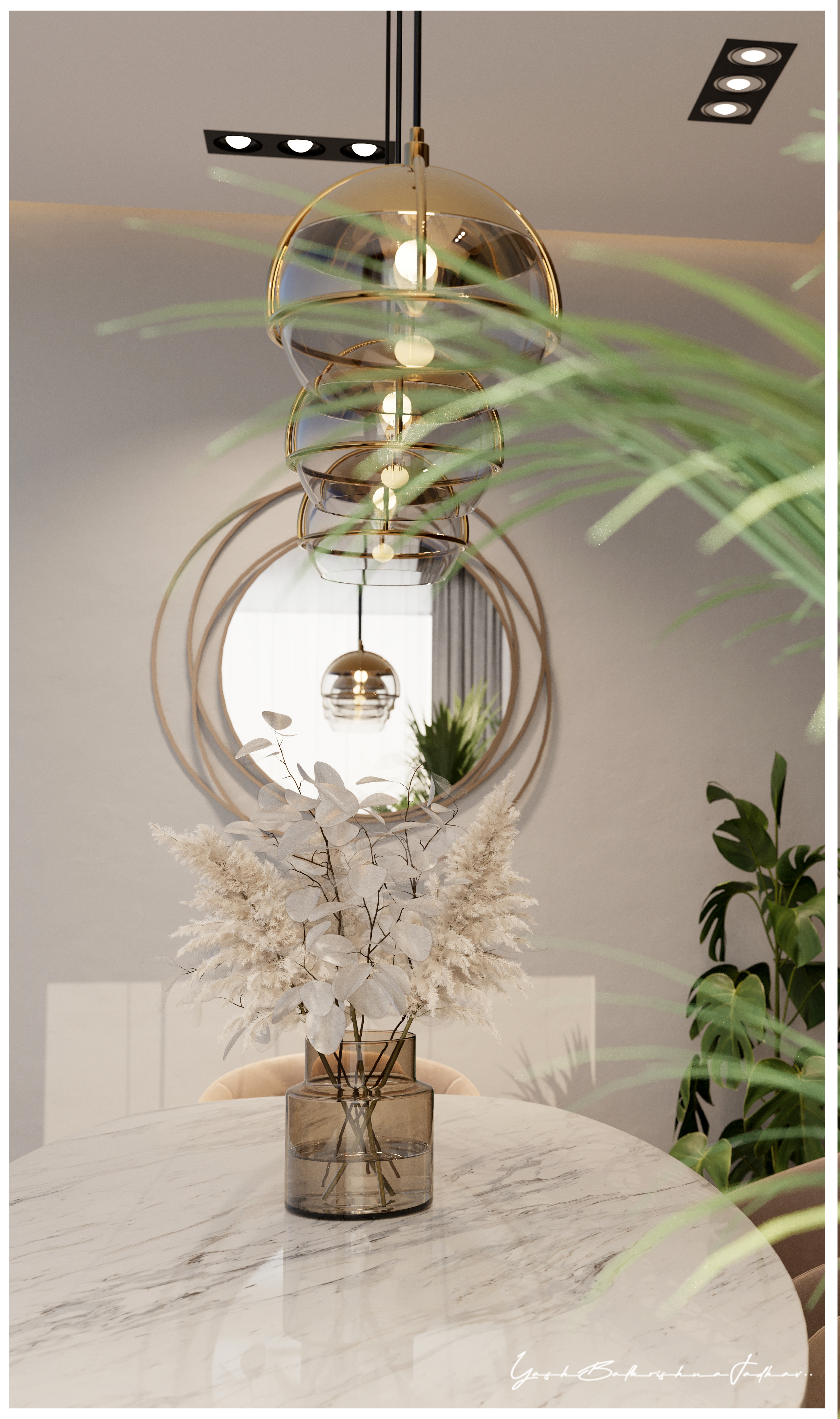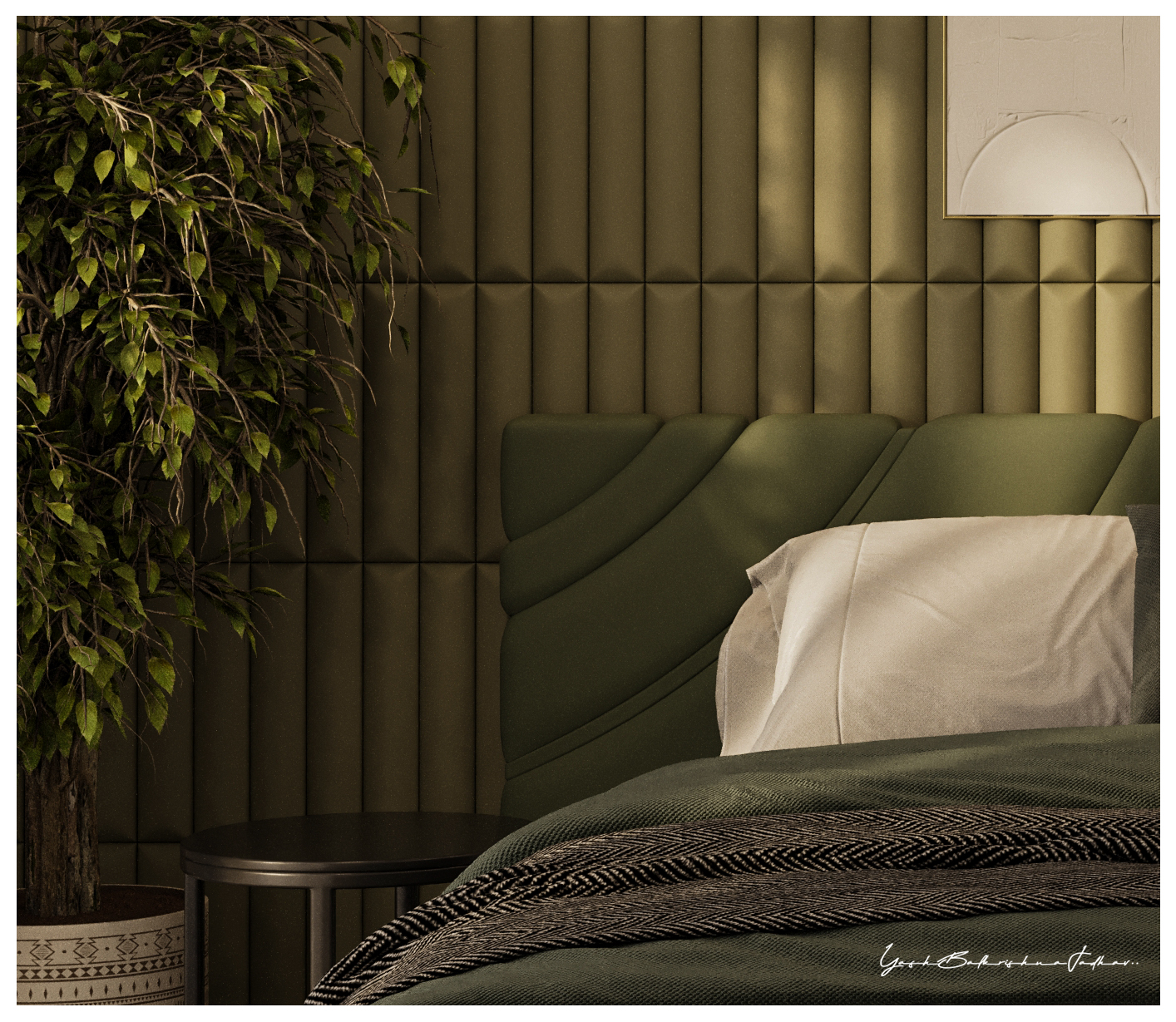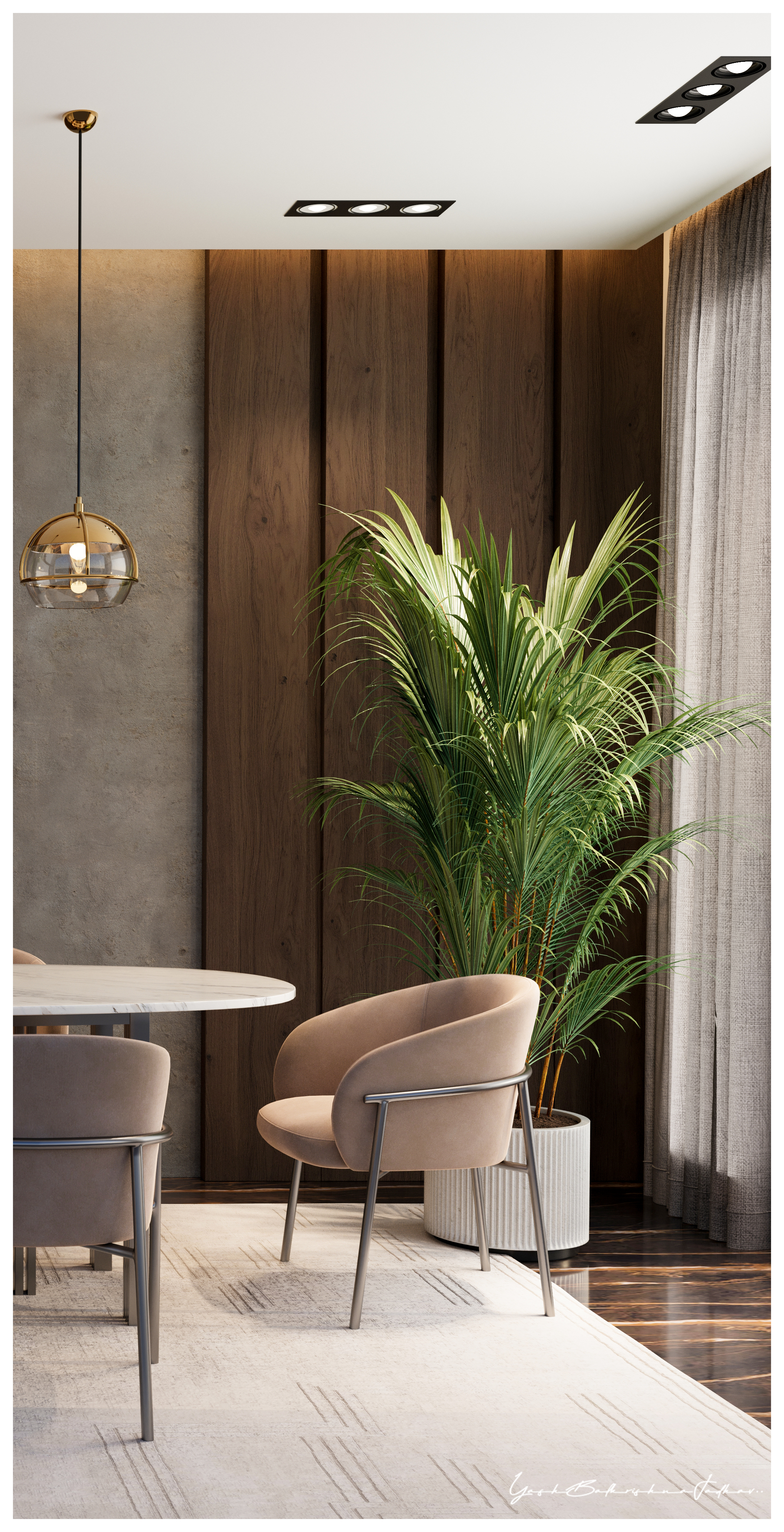 A harmonious blend of grainy wood , subtle grey-white tones and serene greens in interiors